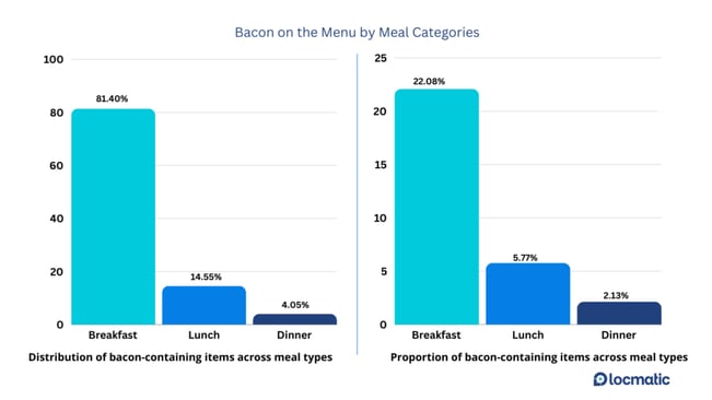 When we look at specific menu items, bacon appears in 22.08% of all breakfast dishes. Lunch follows closely, with 5.77% of menu items incorporating bacon. Think of popular dishes like BLT sandwiches, burgers, and salads. For dinner, however, bacon shows up in only 2.13% of menu items. This indicates that bacon is more of an add-on or a secondary ingredient rather than a main feature later in the day.